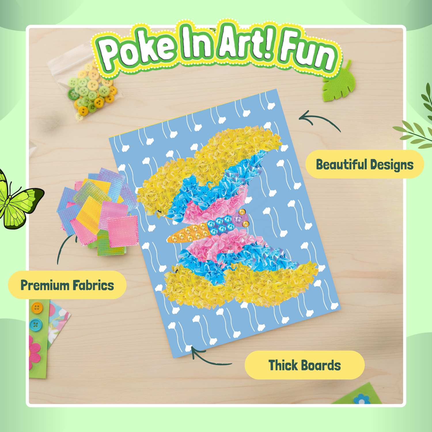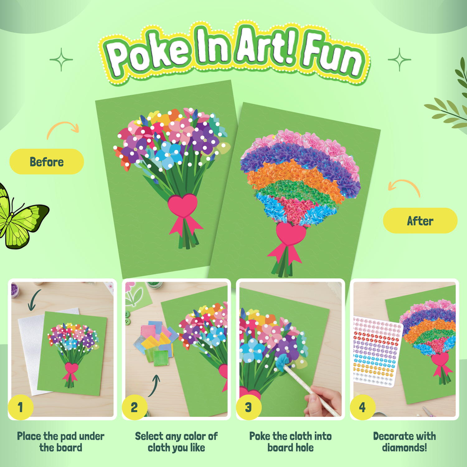 Get ready to poke, pop, and create with the Poke In Art Mess-Free Activity Set! This innovative craft kit lets kids design stunning artwork by simply poking colorful fabric onto pre-printed designs. With a special foam board and safe, easy-to-use tools, there’s no mess, no stress—just endless creative fun! Watch as your little artist transforms simple patterns into vibrant, textured masterpieces. Poke In Art is the perfect blend of creativity and convenience that kids (and parents) will love! Blooming Flowers & Butterflies them