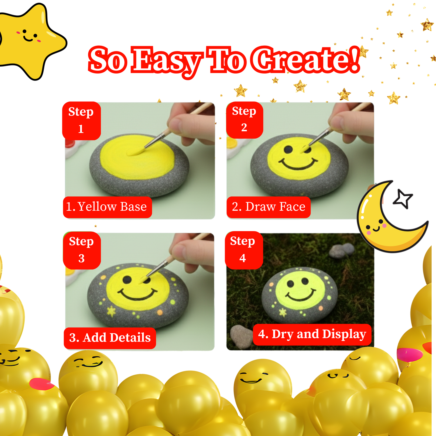 Unleash your inner artist and light up the night with our Glow in the Dark Rock Painting Kit! Perfect for kids and adults alike, this kit has everything you need to create vibrant, luminous masterpieces. Inside, you'll find a selection of smooth river rocks, a set of brilliant glow-in-the-dark paints, and a variety o brushes to unleash your creativity. Plus, we’ve included fun stencils and stickers to get you started on designing your rockin’ artwork!
